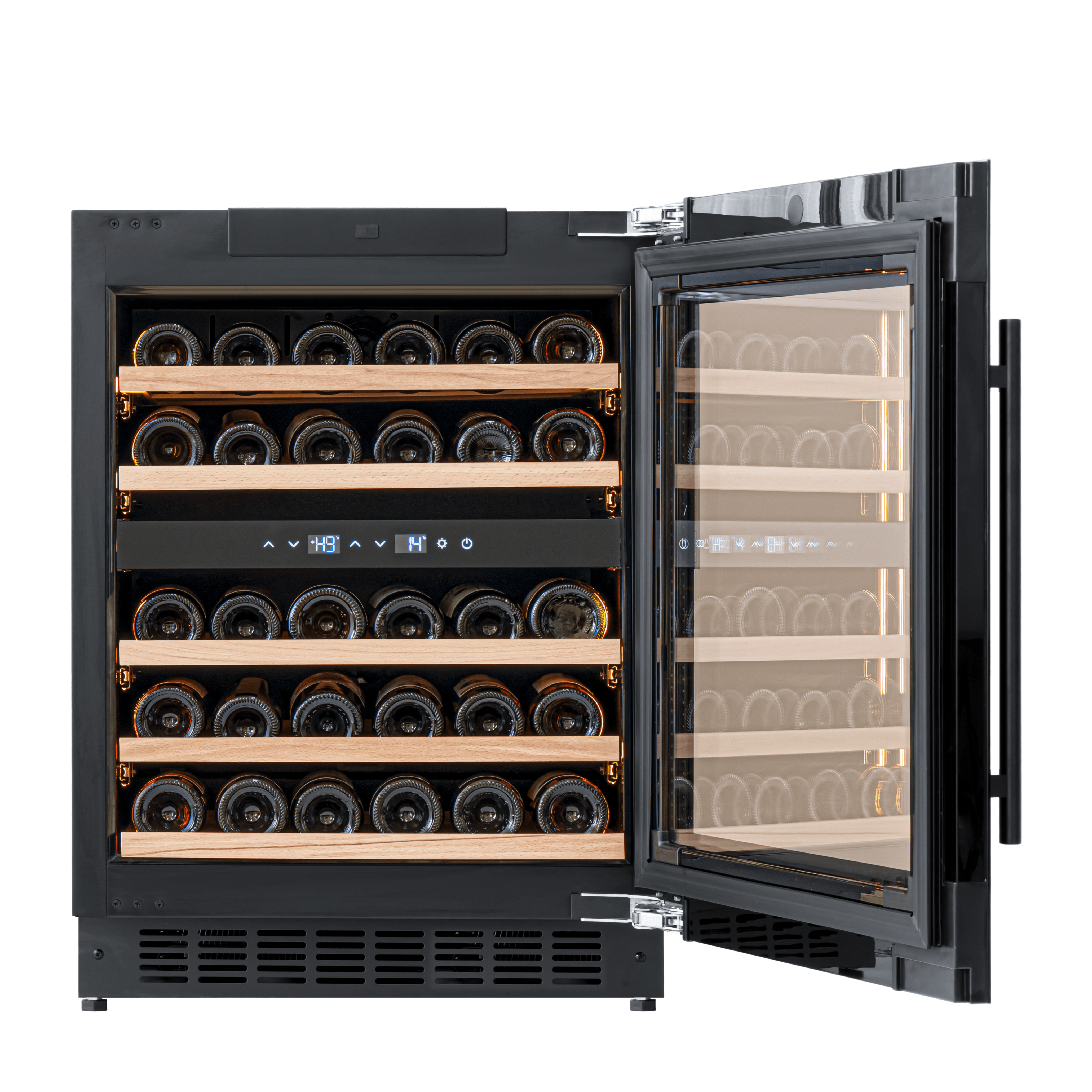 De binnenkant van de wijnkoelkast heeft een structuurafwerking om de vochtigheidsregeling van 55-85% te bevorderen