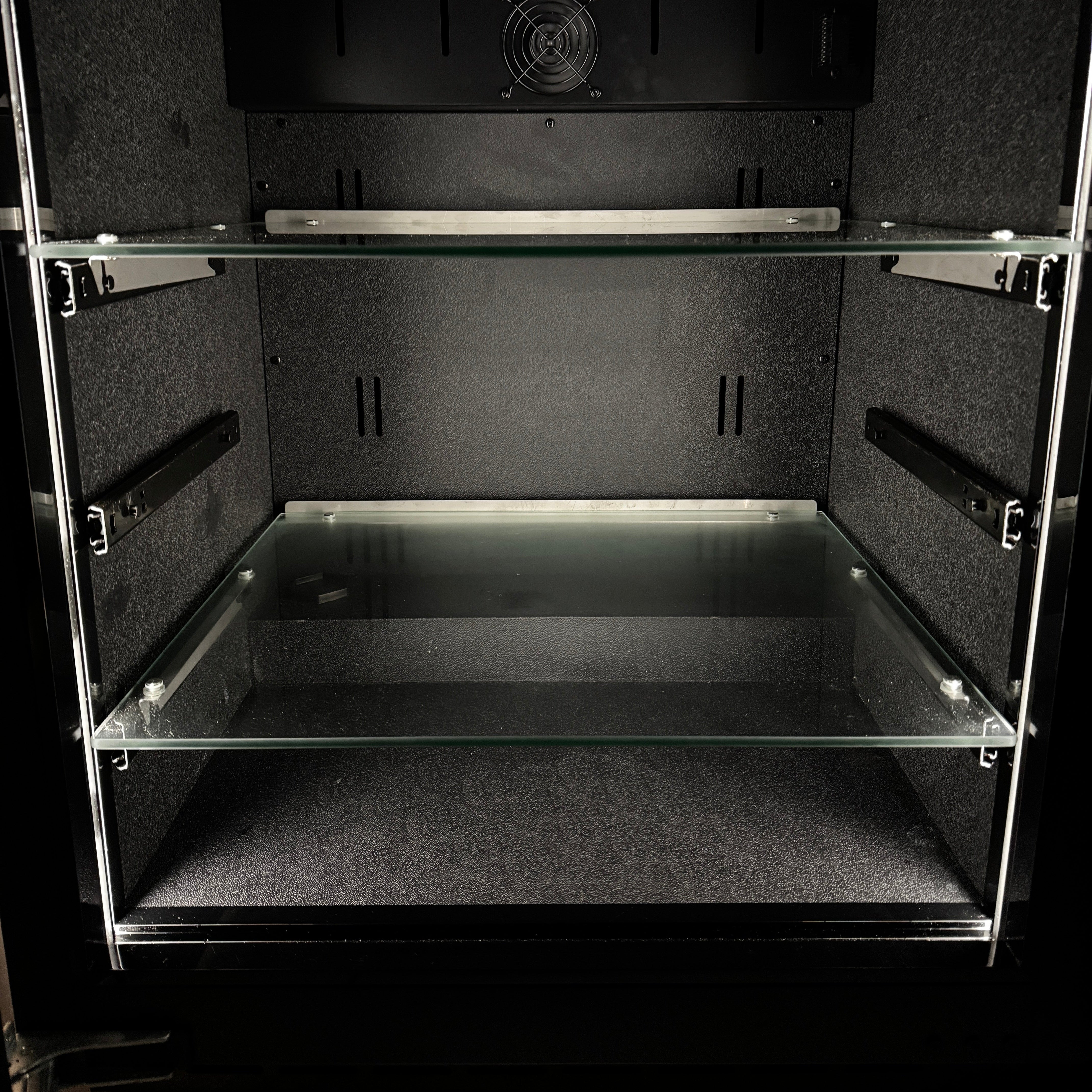 Telescopic glass shelves: 2 in total + fixed base shelf
