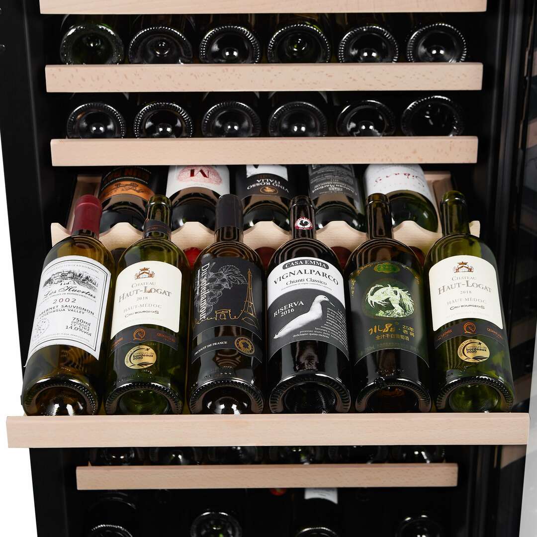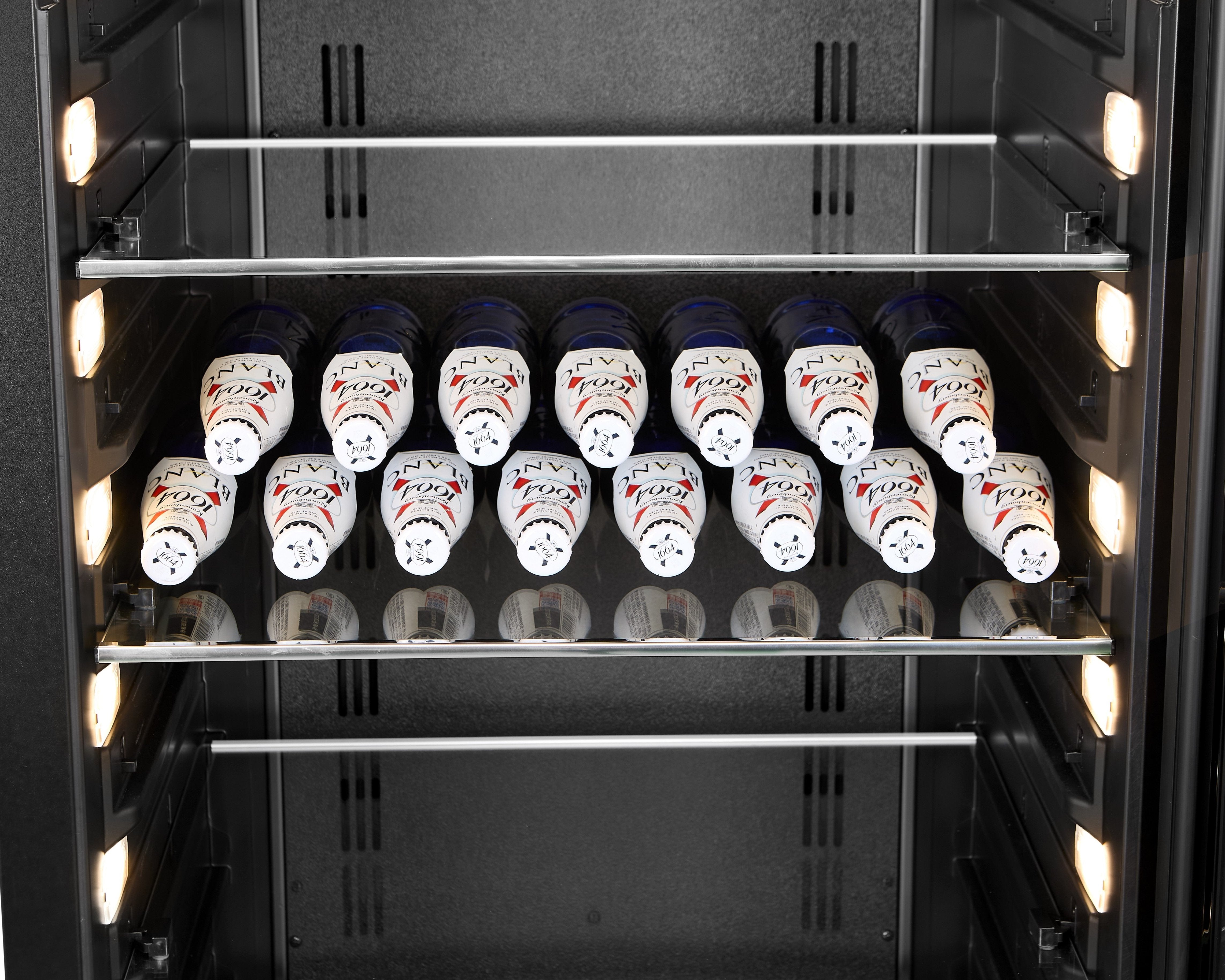 De wijnzijde van de combinatie biedt gemakkelijke toegang tot de flessen met uitschuifbare telescopische rails die tot 80% uitschuifbaar zijn. De flessen staan ​​nek aan nek om de maximale opslagcapaciteit te bereiken en zijn geschikt voor zowel Bordeaux- als Bourgogneflessen.